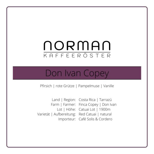 Dieser Kaffee kommt von Don Ivan aus Costa Rica. Ich habe seine Tochter Solsiré und ihn 2023 kennengelernt und wir sind über Social Media in Kontakt geblieben. Die Kaffeefarm Copey liegt in der bekanntesten Kaffeeregion Costa Ricas: Tarrazu. Die Familie betreibt in Santa Maria de Dota eine Aufbereitungs- und Verarbeitungsstation. Die Varietät Red Catuai hat besonders leuchtend rote Kaffeekirschen, die natural verarbeitet wurden – d.h. sie wurden in der Sonne getrocknet. Dadurch wird der Geschmack von einem Beerenkompott mit einem weichen Mundgefühl erreicht.