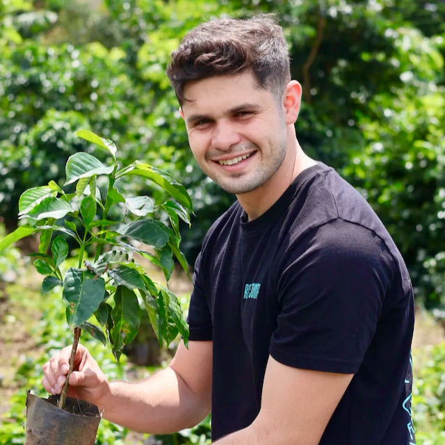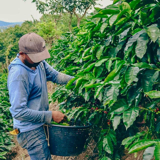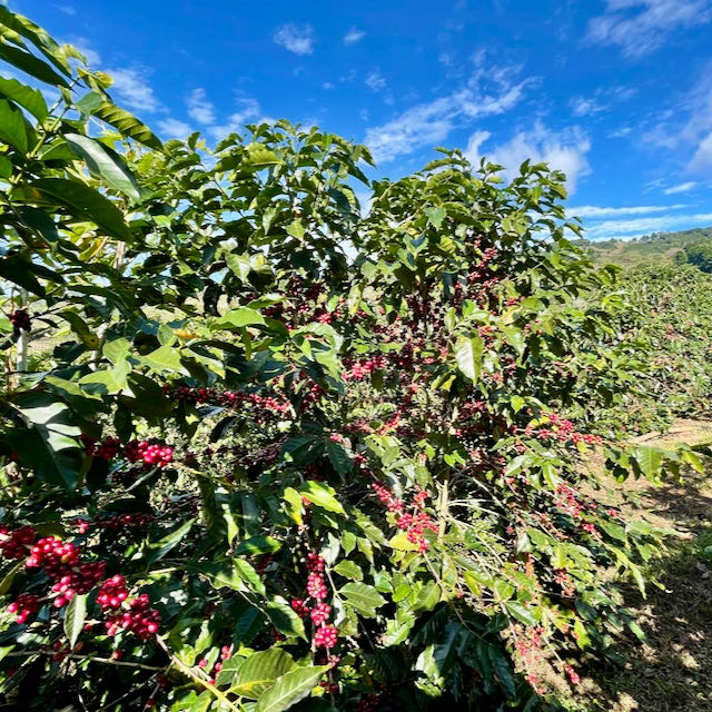 Dieser Kaffee kommt direkt von den Hermanos Aguilera aus Costa Rica. Ich habe Dylan 2023 bei meinem ersten Cupping auf meiner Kaffeereise kennengelernt. Die Familie betreibt seit Jahrzehnten mehrere Kaffeefarmen. Der San Roque kommt von der Finca El Monte. Die Varietät San Roque ist eine natürliche Mutation der kenianischen SL-28 und wurde als black honey verarbeitet. Dafür wird die äußere Schale der Kaffeekirschen nach der Ernte entfernt und die Bohnen mit dem Fruchtfleisch getrocknet. Je nach dem, wie viel Fruchtfleisch erhalten bleibt, sehen die Bohnen dann beim Trocknen unterschiedlich aus. Bei diesem black honey bleibt das ganze Fruchtfleisch erhalten und trocknet dunkel ein. Dadurch wird der fruchtige und süße Geschmack unterstrichen und es entstehen sehr komplexe Aromen von Beeren, Nüssen und frischem Karamell.
