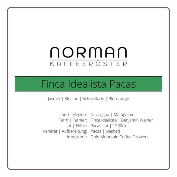Ich habe Ben 2019 auf der Kaffeemesse World of Coffee in Berlin beim Cuppen seiner Kaffees kennengelernt. Die Goldmountain Coffee Growers sind ein Zusammenschluss von Farmen in Nicaragua zum direkten Handel zwischen Farmerinnen und Röstereien. Der Pacas Kaffee kommt von der Finca Idealista – das ist die Musterfarm, auf der Praktiken wie Unkrautjäten mit Machete anstatt mit Herbiziden, Einsatz von Pilzen zum Eindämmen von schädlichen Insekten, Nutzung von vulkanischen Filtern zur Wasserfilterung oder Hühner auf dem Kompost etabliert werden. Auch die Bezahlung der Erntehelfer ist höher als normal und ein eigener Regenwald schützt die Artenvielfalt der Region. Pacas ist eine Varietät, die – ähnlich wie Caturra – eine natürliche Mutation mit kleiner Wuchshöhe der Kaffeesträucher ist. Die Familie hat diese Varietät auf dem ersten Lot (Feld) der Farm angebaut. Durch die gewaschene Aufbereitung, bei der die Kirschen geschält und das Fruchtfleisch vor dem Trocknen abgewaschen wird, wird der klare Charakter des Kaffees unterstichen. Auffällig sind die blumigen Noten und eine angenehm fruchtige Süße.