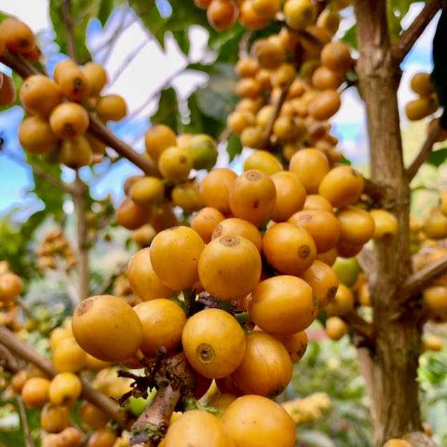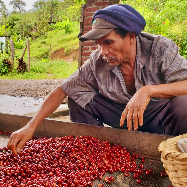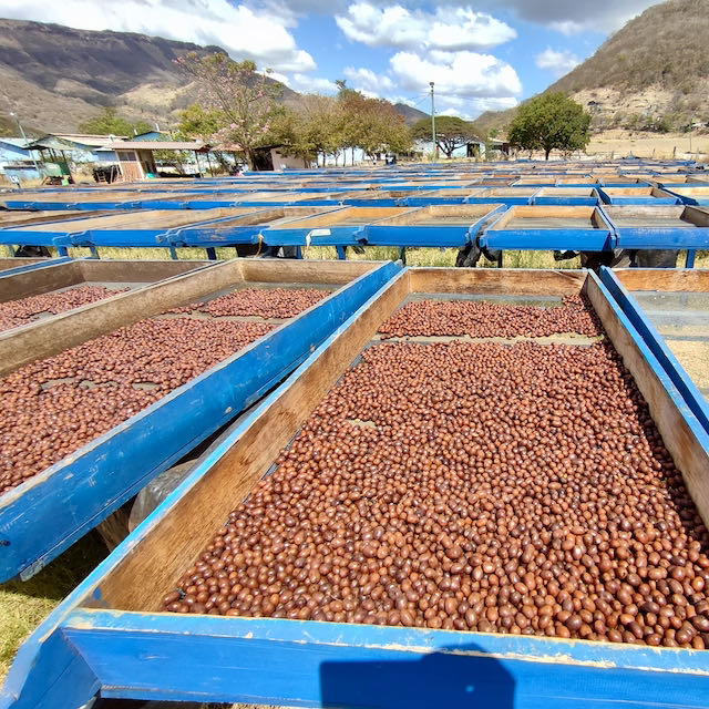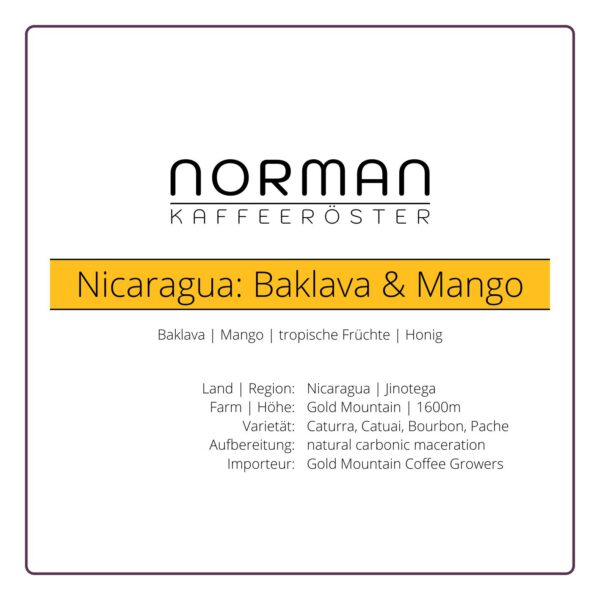 Dieser besondere Baklava und Mango Kaffee kommt von den Goldmountain Coffee Growers: ein Zusammenschluss von Farmen in Nicaragua zum direkten Handel zwischen Farmerinnen und Röstereien. Der Rohkaffee wird speziell nach seinem Geschmacksprofil ausgewählt, indem die Bohnen jedes Erntetages nach der Aufbereitung probiert werden. Außerdem wird bei der Ernte darauf geachtet, nur perfekt reife Kirschen zu pflücken, um sie mit der carbonic maceration Methode zu verarbeiten. Dieser Fermentationsprozess stammt aus der Weinverarbeitung: dazu werden die geernteten Kirschen in Tanks gefüllt und die Luft durch CO2 verdrängt. Danach werden die kompletten Kaffeekirschen für 34 Tage auf erhöhten Trockengestellen getrocknet. Der Kaffee ist süß wie Honig und schmeckt nach tropischen Früchten.