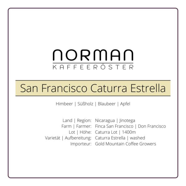 Don Francisco ist der erste Farmer, der zu den Goldmountain Coffee Growers dazugekommen ist: ein Zusammenschluss von Farmen in Nicaragua zum direkten Handel zwischen Farmerinnen und Röstereien. Der Caturra Kaffee kommt von der Finca San Francisco und ähnelt äthiopischen Kaffees. Durch die gewaschene Aufbereitung, bei der die Kirschen geschält und das Fruchtfleisch vor dem Trocknen abgewaschen wird, werden die fruchtigen Aromen betont. Besonders ist der Geschmack nach Nuss-Schokolade mit Blaubeernoten.